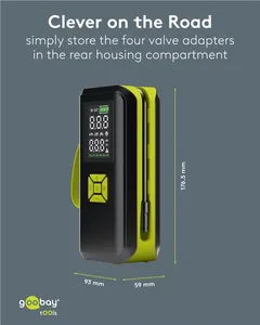 Perfekt som däckpumpare när du är på språng: De fyra ventiladaptrarna förvaras i ett praktiskt fack på baksidan av enheten.