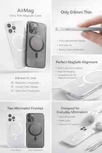 Snapcase AirMag 0.7 kombinerar minimalistisk design med MagSafe-funktionalitet. Endast 0,7 mm tunt, med matt semitransparent yta som skyddar mot repor och fingeravtryck – utan att dölja telefonens ursprungliga stil.